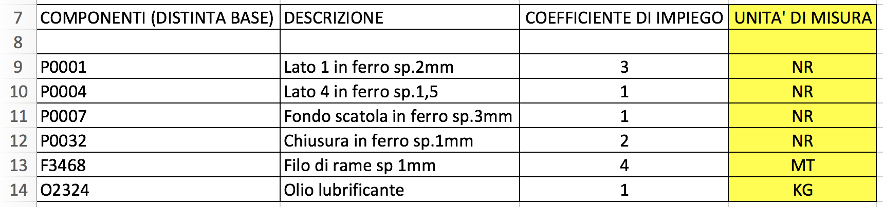 La distinta base è quindi comprensiva di alcuni dati essenziali per capire l'effettiva composizione del nostro articolo : nella colonna COMPONENTI abbiamo il codice dell'articolo, nella colonna DESCRIZIONE la relativa descrizione e nella colonna COEFFICIENTE D'IMPIEGO abbiamo il numero di unità richieste per la produzione di una (1) unità del nostro prodotto SEMILAVORATO.